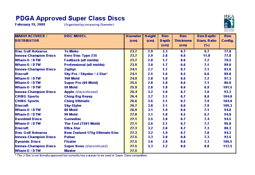 Players can use any pdga approved super class discs during the round. A limited supply of super class will be available during registration (zephyers and superheroes). See below for a list of approved super class discs.